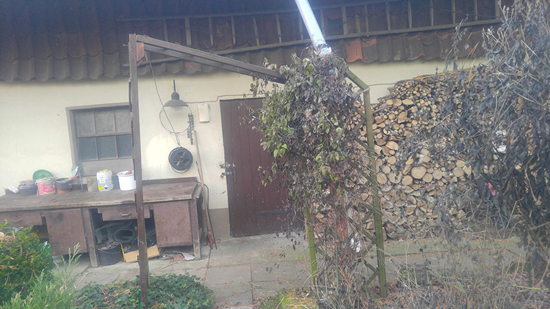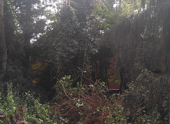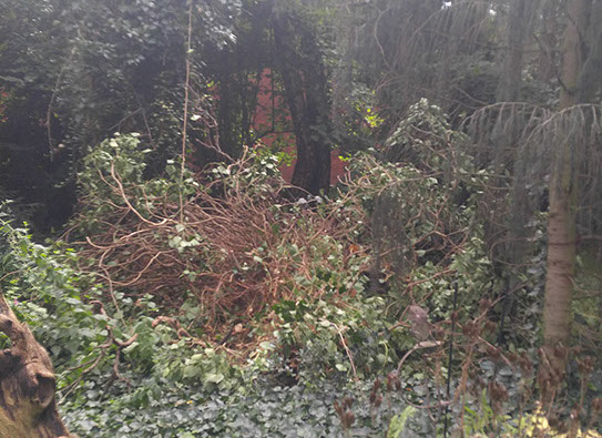 Der abgestobene Birnbaum, der mit Efeu voll bewachsen ist und in der Baumkrone ein großes Efeunest für die Fledermäuse beherbergte ist bei starkem Sturm abgebrochen und zu Boden gefallen.