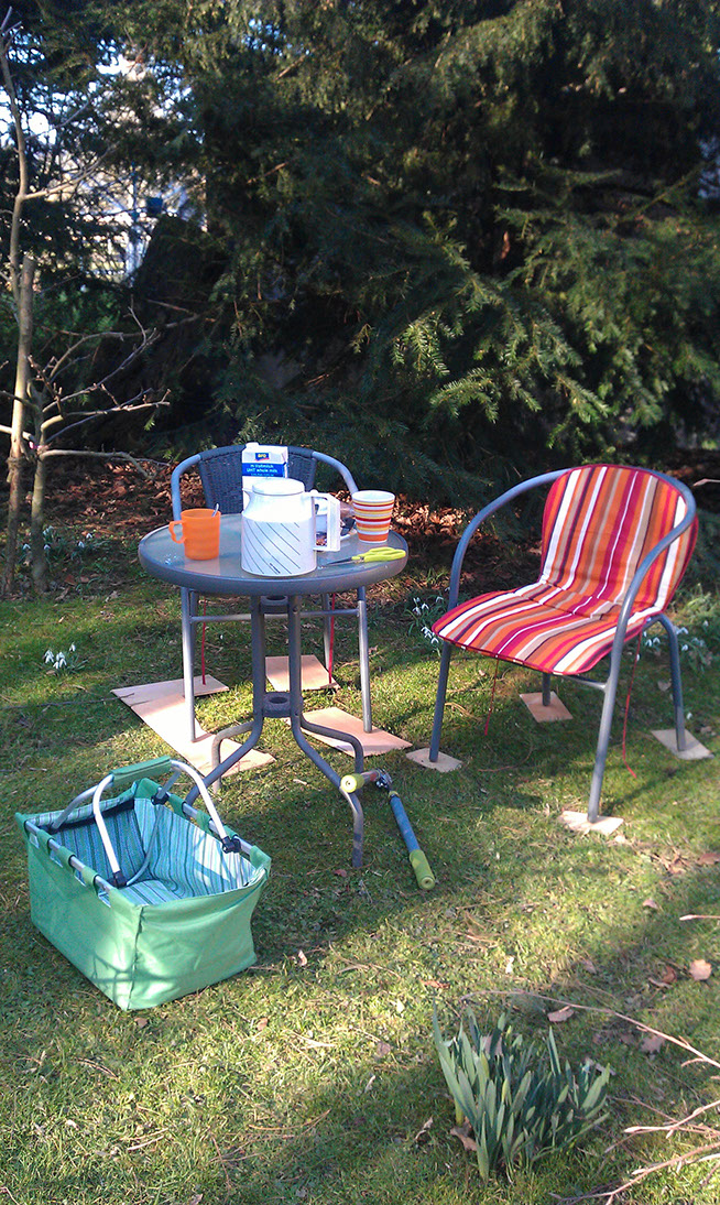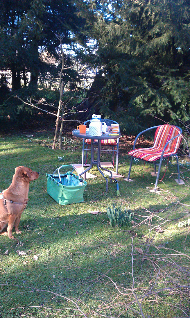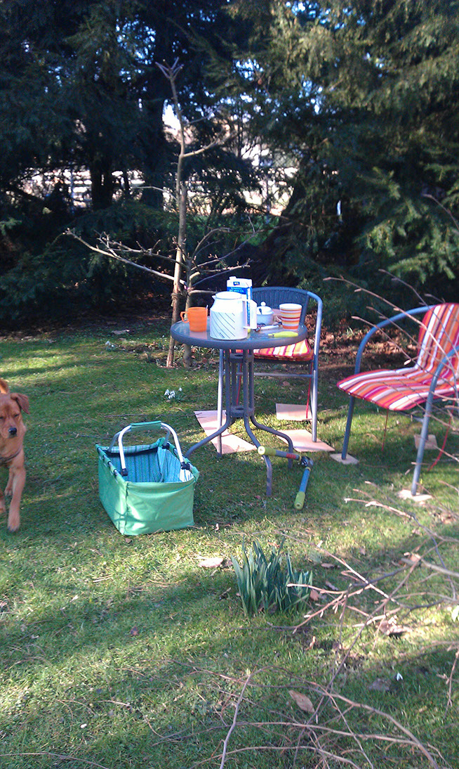 Endlich - die ersten Sonnenstrahlen laden zum Vereweilen im Garten ein. Zunächst erstmal eine Kaffeepause in der schönen Sonne. Benita passt auf bevor es losgeht. Hier ein paar Bilder