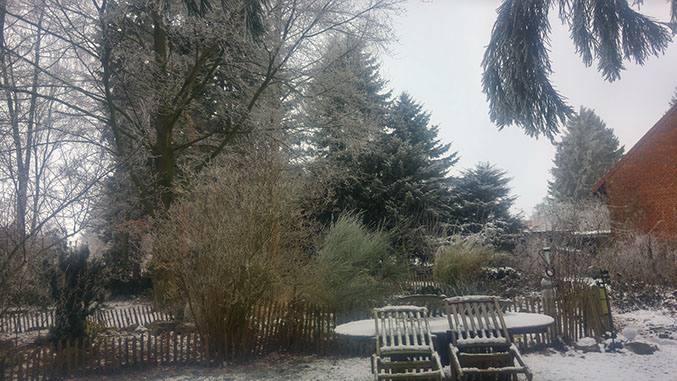 Hier einige Impressionen vom verschneiten Waldgarten. Die Bilder mussten sehr früh erstellt werden (09.45. Uhr), da die weiße Pracht sich schnell wieder verabschiedet hat. Daher sind die Aufnahmen etwas dunkel.