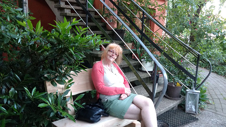 Die neue Gartenbank wird eingeweiht. Sichtlich zufrieden genießt die Hausherrin ihren neuen Lieblingsplatz.